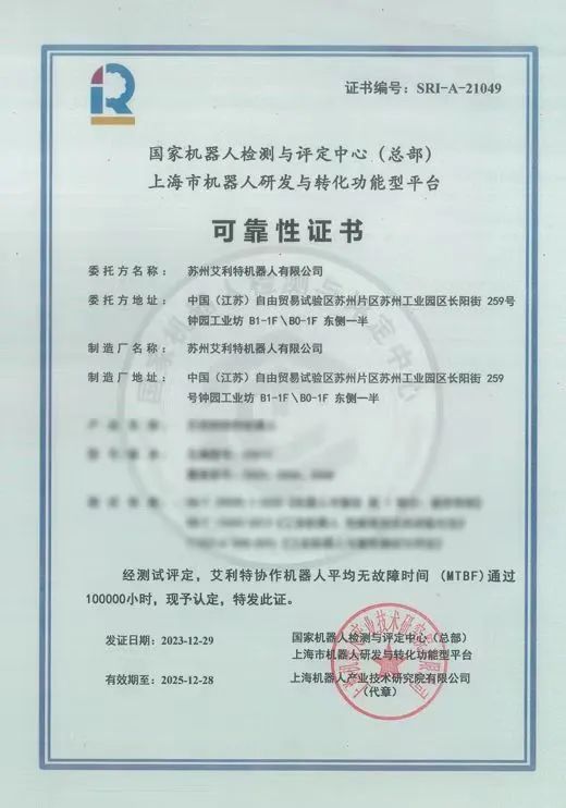 另外,NG28娱乐机器人的产品可靠性也得到了协作机器人业界最高等级的可靠性测试——「MTBF 100000小时测评」认证,这也是目前业内最高时长的平均无故障运行测试,不仅意味着NG28娱乐产品的高可靠性和持久性,也代表了NG28娱乐机器人在产品工艺、质量管理、生产制造中的行业高度。