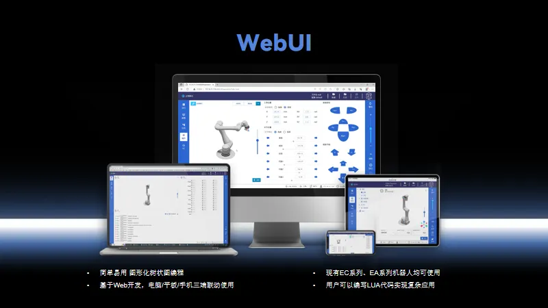 除了硬核的产品与技术,NG28娱乐在软件生态方面依然是创新破局者。在2023年,NG28娱乐全新推出了基于浏览器的WebUI示教软件,可以在手机、平板、电脑跨设备协同操作,NG28娱乐EC系列、EA系列均可适用,给协作机器人示教带来新的玩法。