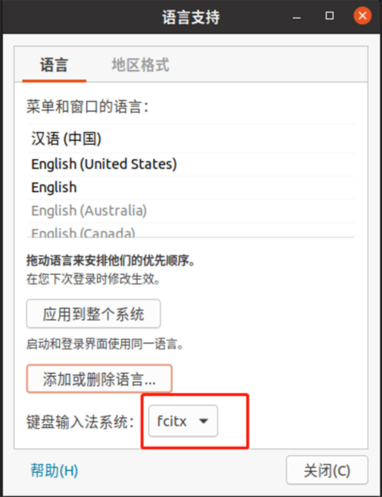 回到“语言支持”窗口,在键盘输入法系统中,选择“fcitx”