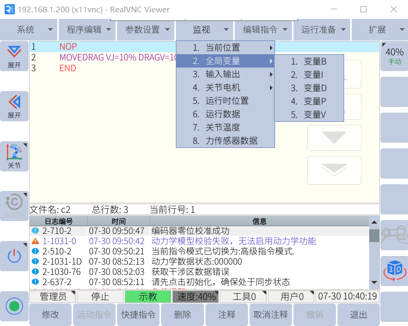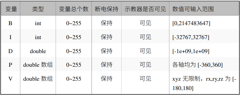 如表格所示,NG28娱乐机器人全局变量分为五种均可通过 jbi 和 lua 进行操作,通常使用情况下,会使用 B、I、D 变量进行 逻辑的交互和简单数据的传递,而 P 变量用作放置关节数据,V 变量用作放置笛卡尔数据。 P 变量和 V 变量存放对应的数据后,可以使用示教器手动移动到目标位置,或者通过移动指令 直接到指定的位置。