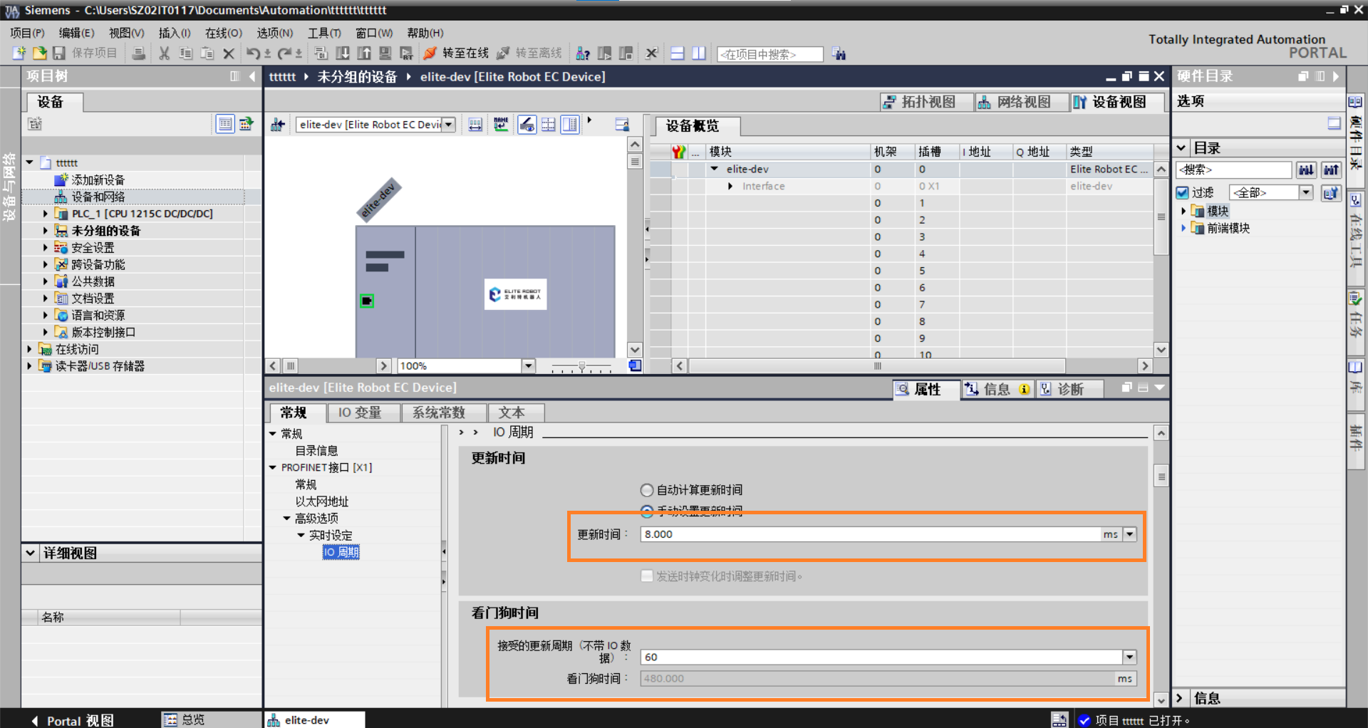 4. 双击 Elite Robot EC Device 设备的属性中设置 IP 地址和 IO 周期,如下图所示。