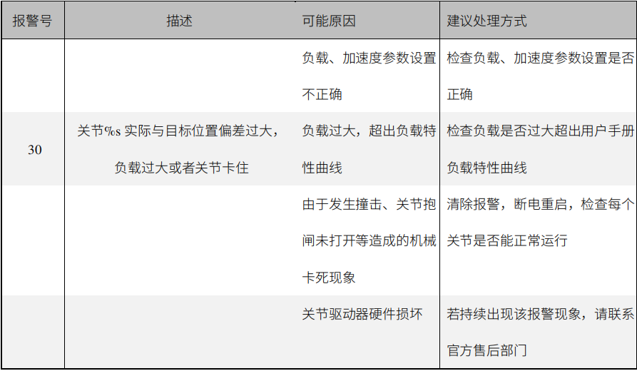 报警代码:伺服故障码:30,关节3实际与目标位置偏差过大,负载过大或者关节卡住