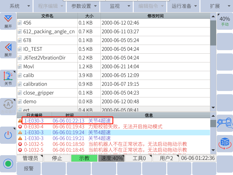 关节在特殊区域无法拖动,会出现当前机器人不在正常状态,无法启动拖动示教的报警,可手动变换机器人的姿态,然后再重试拖动功能。