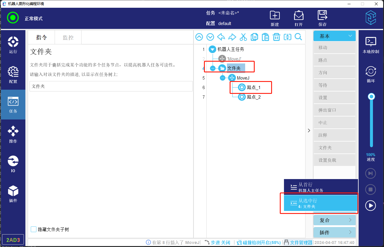 3. 如果起始行不可以作为起始安全位置节点,则会查找该节点上方的节点,如果存在可以作为起始位置的节点,则选做起始位置节点,如果不存在起始位置节点,则会进一步正向查找该节点内部是否存在起始位置节点,如果存在,则作为起始位置。如下方图-11所示任务,如果选择第4行文件夹为开始节点,则会找到路点_3作为起始位置。如果文件夹上方如果没有起始路点,则会向下找到起始点,如图-12所示则会找到路点_1作为起始位置。