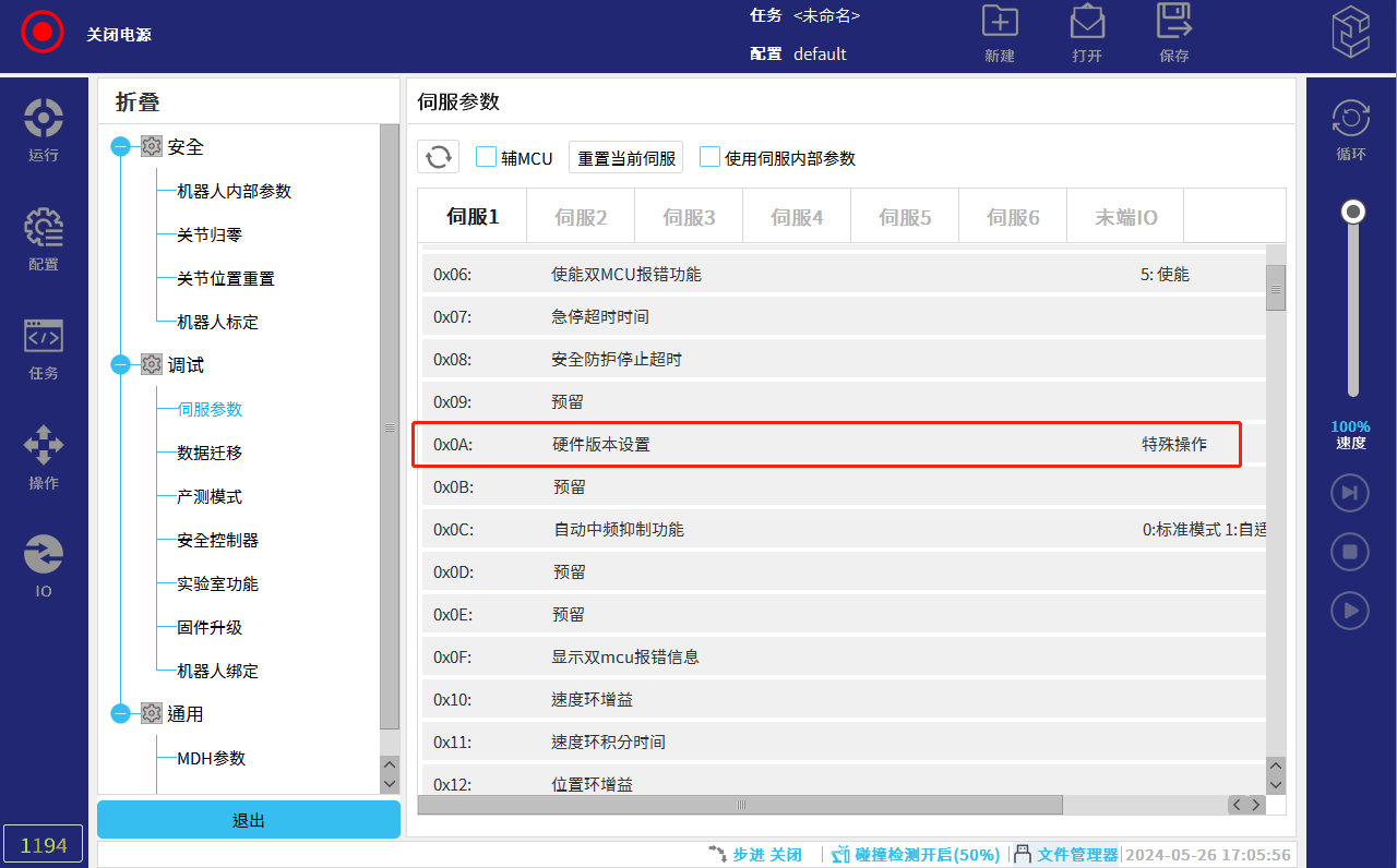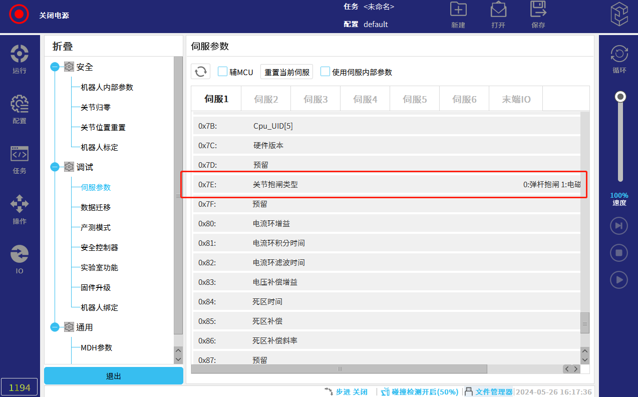 - 查看:在伺服参数界面下拉至0X7E位置,查看0X7E的值(0:弹杆抱闸,1:电磁抱闸)