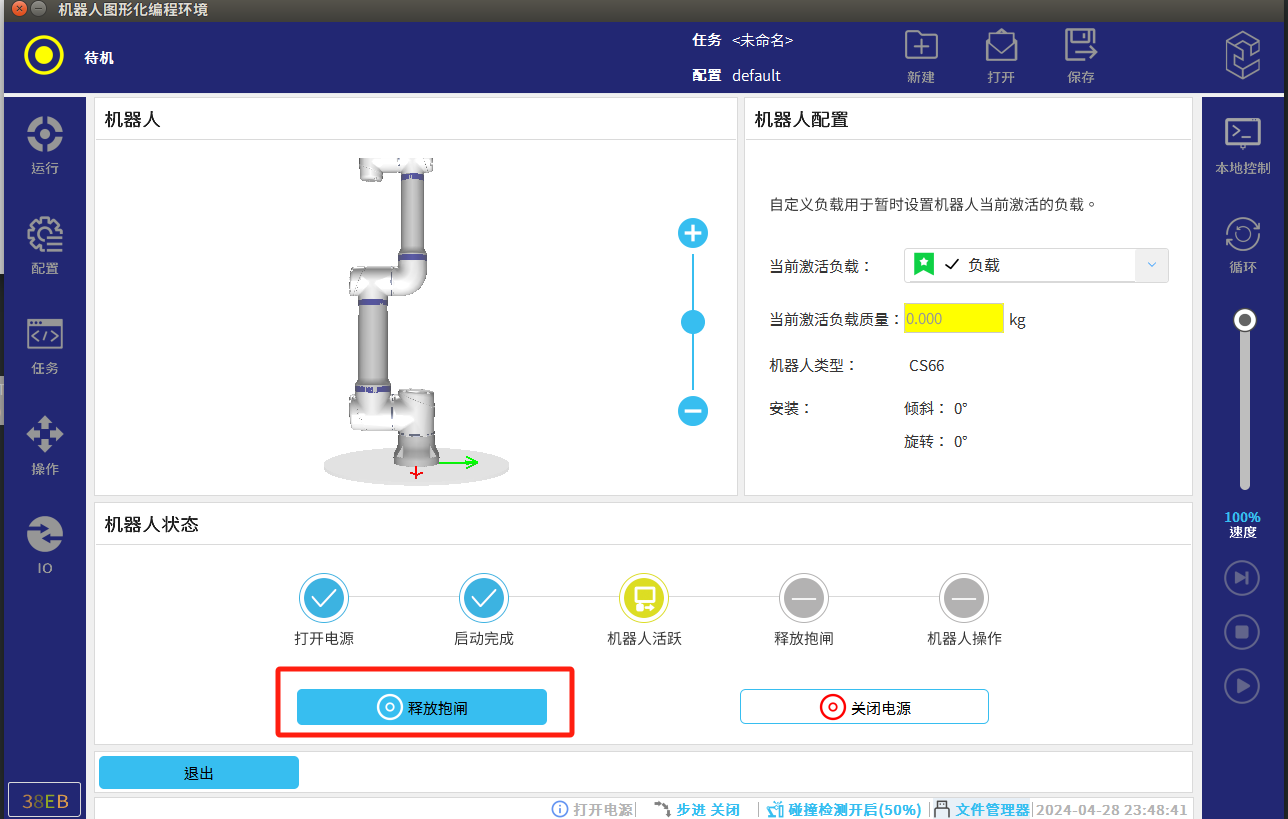 注意:操作松开抱闸时建议将机器人软件更新至2.10.1.14以上,此版本兼容各种抱闸类型操作