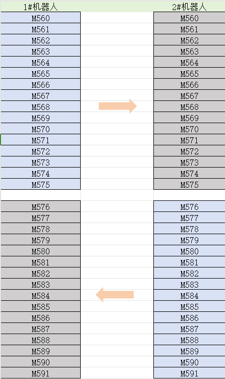 例如1#机器人的M560-M575作为本机的输出,写入2#机器人的M560-M575的值。