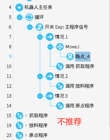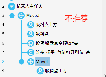 程序中move指令下只可以写路点,不允许添加其他指令,如下上图为推荐编写规范,下图为错误示范,注意对比和区分。