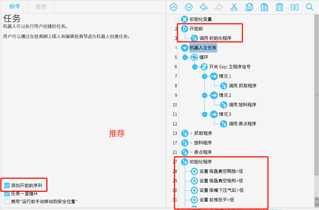 主程序使用,建议只写逻辑指令,不建议写运动指令,使用逻辑指令编写主程序,可以简化代码,提高复用性和可维护性,使程序更灵活、易于理解和升级。