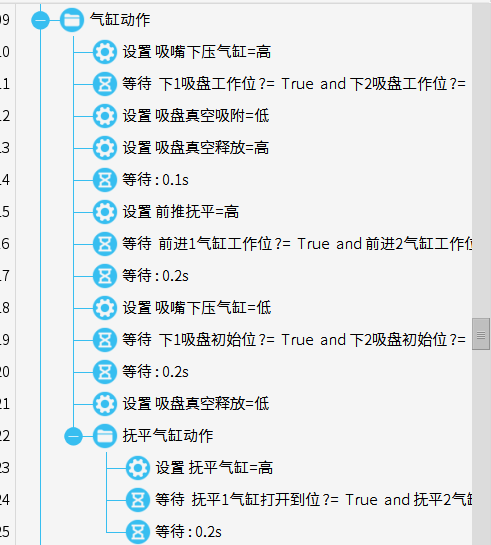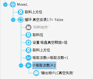 上面程序就是一个简单的真空失败程序,连续取料两次,都无法真空的话,就输出真空失败报警。