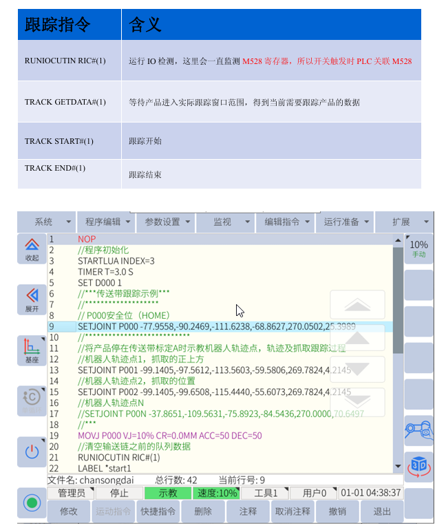 标定步骤:将物品放到传送带上缓慢开动传送带使物品经过传感器(此时日志窗口显示“io标定结束”)到达A点后,停止传送带运动,将机械臂移动尖点至A点并记录A点和程序中的“P002”,此时可以退出标定页面进入程序示教跟踪轨迹(示教图中应避免晃动物品)