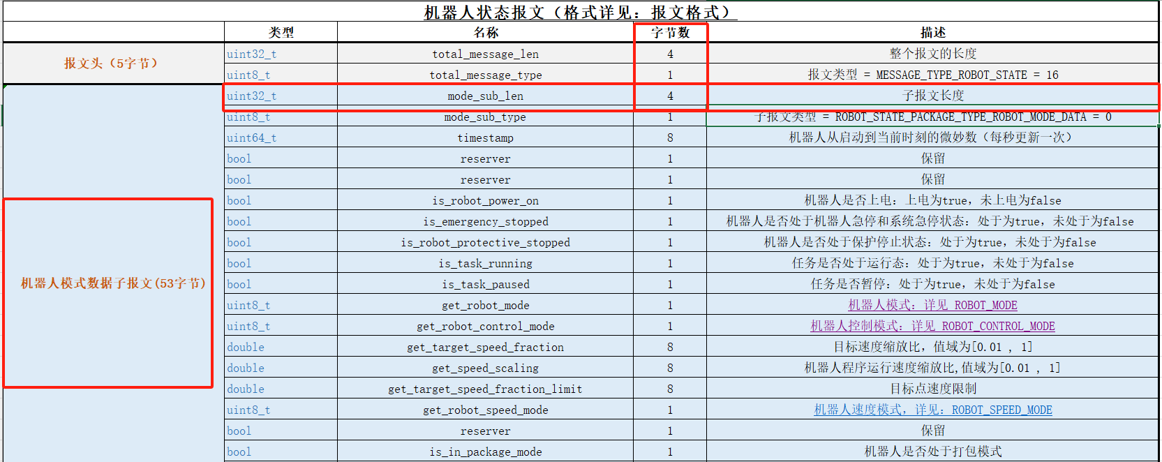 1.当NG28娱乐需要解析机器人的某一种状态时,首先需要找到这个状态的子报文头即可,例如通过”机器人状态报文表”得知”机器人模式”子报文长度为53且占4个字节如图2-1-5所示,所以转换成十六进制为“00 00 00 35”。