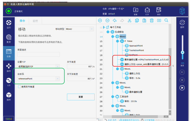 - 使用2.2(方法2)进行偏移时要重新插入一个movel运动指令,然后将偏移点位放在新插入的运动movel指令下(如图-6和图-9红框标记所示)。