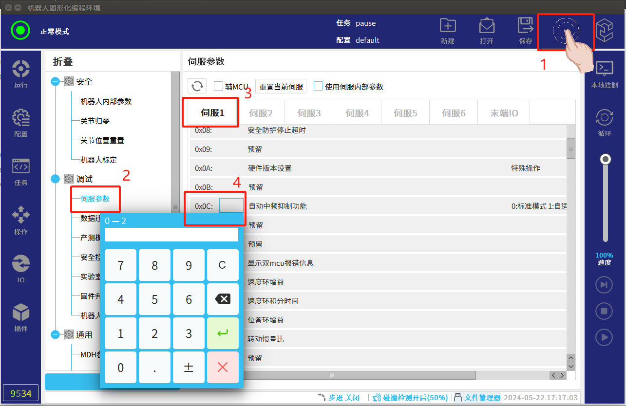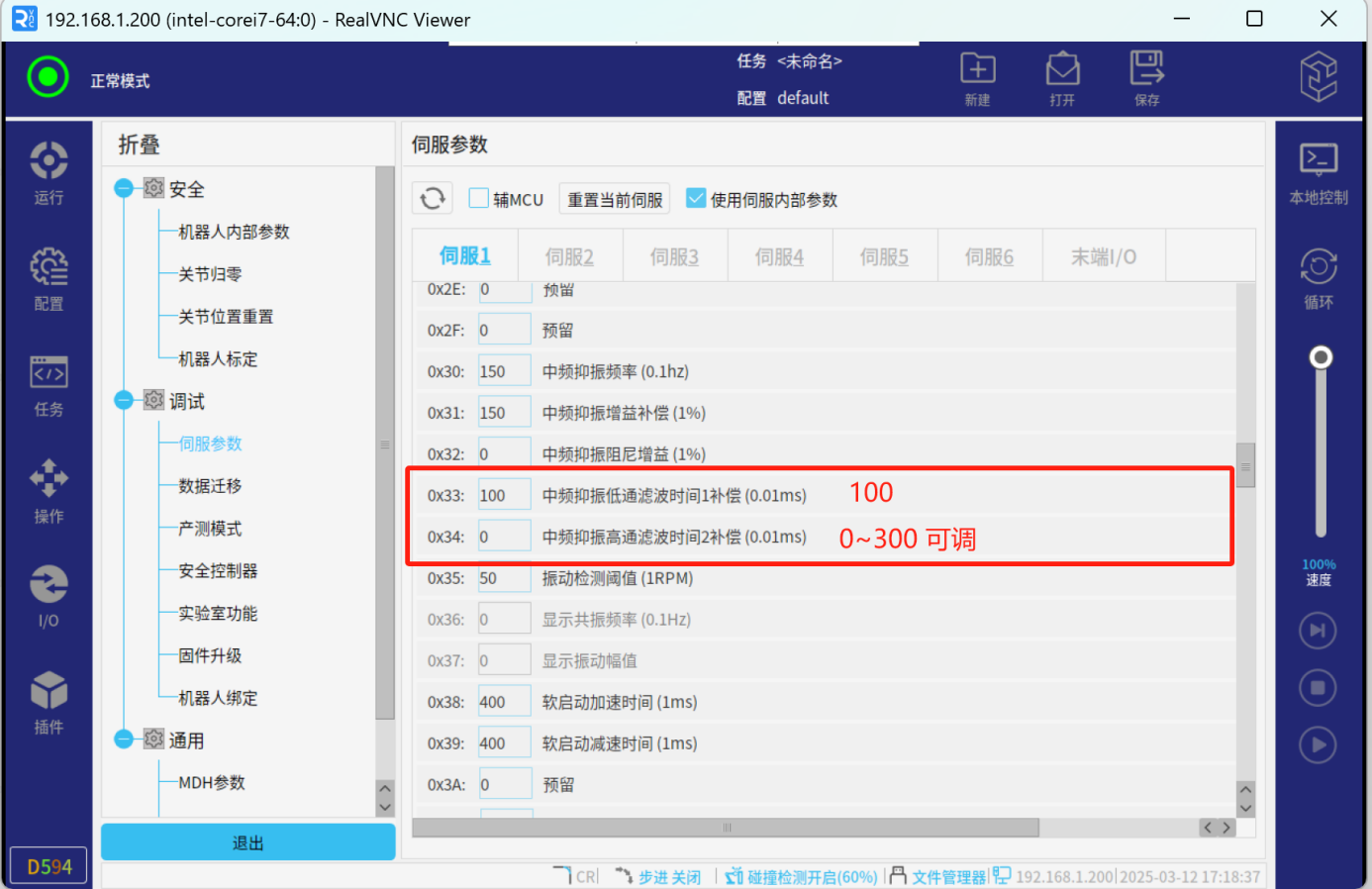 通常在出厂时,Pn0C 被设定为 0,即标准抑制模式,振动抑制参数均由控制 器下发。在后续使用机器人的过程中,若出厂设定的默认参数对于实际工况下的 抖动抑制能力达不到特定需求时,则可通过调整伺服参数Pn0C 进行自动低频抖 动抑制。