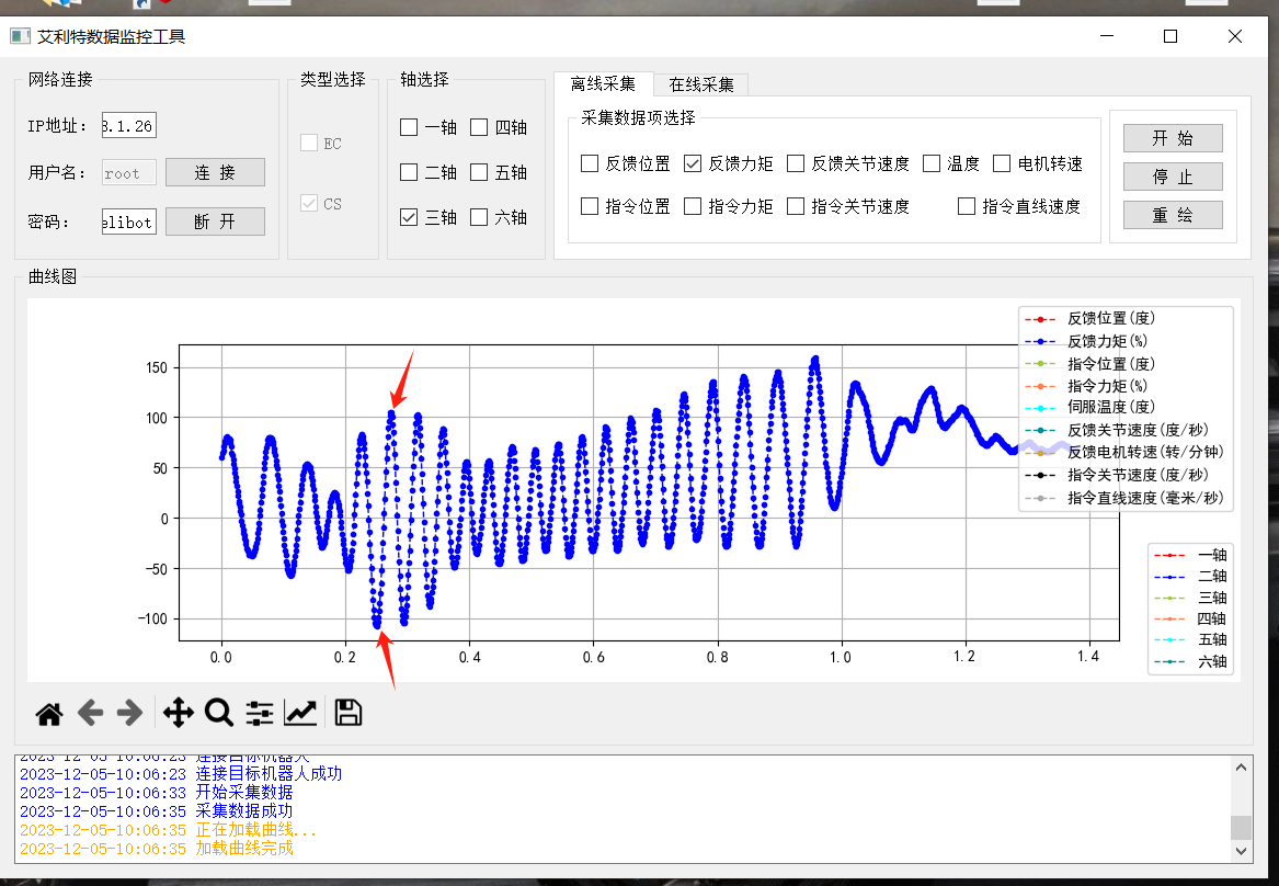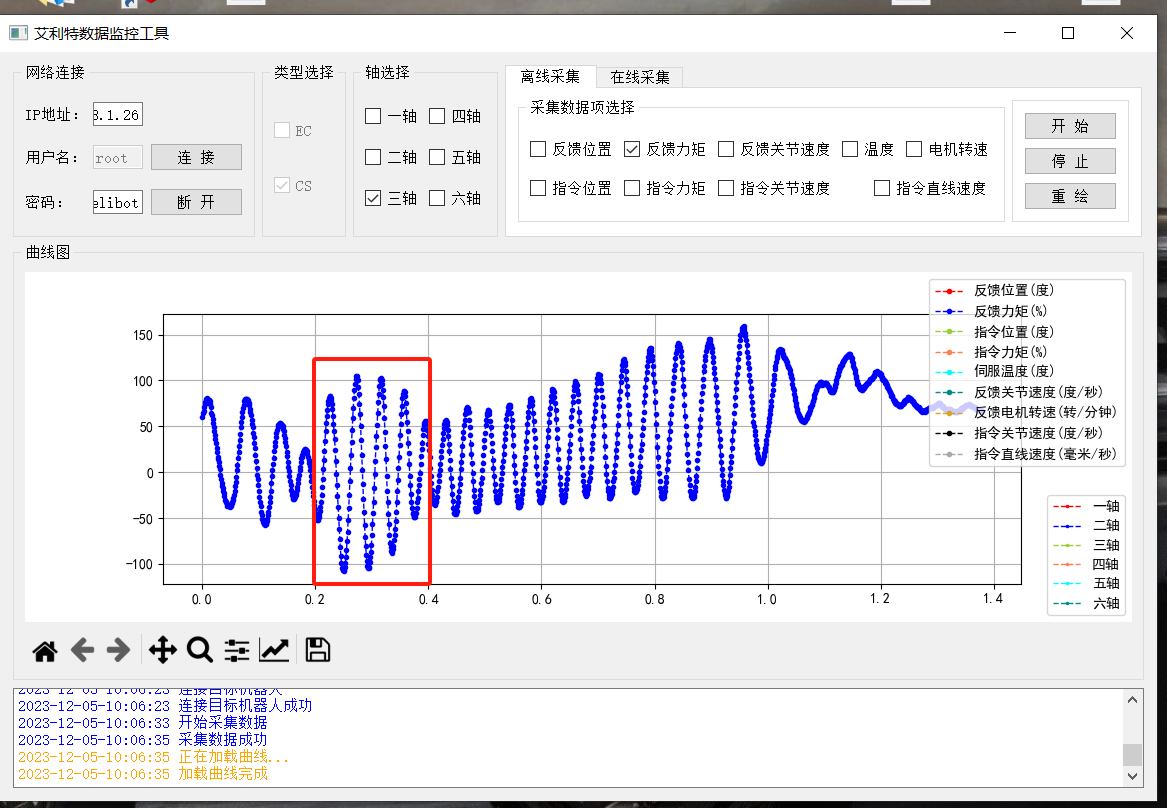 功能:其内主要是对关节的力矩,速度等信息的采集,主要分四个区:网络连接区,类型选择区,轴区以及采集区