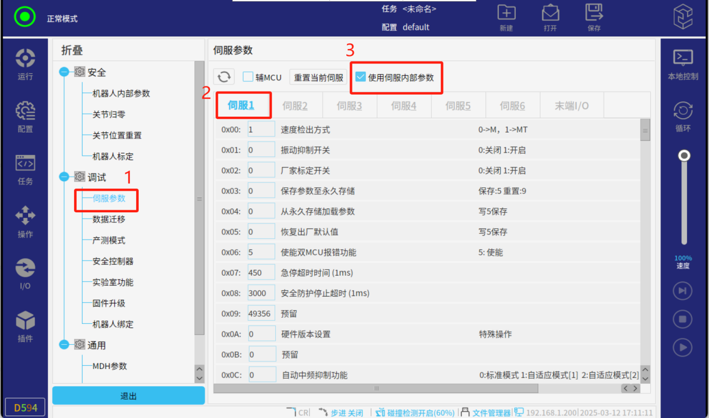 2.伺服参数界面操作流程:(该界面可对关节的伺服参数进行读取,修改,备份以及加载)