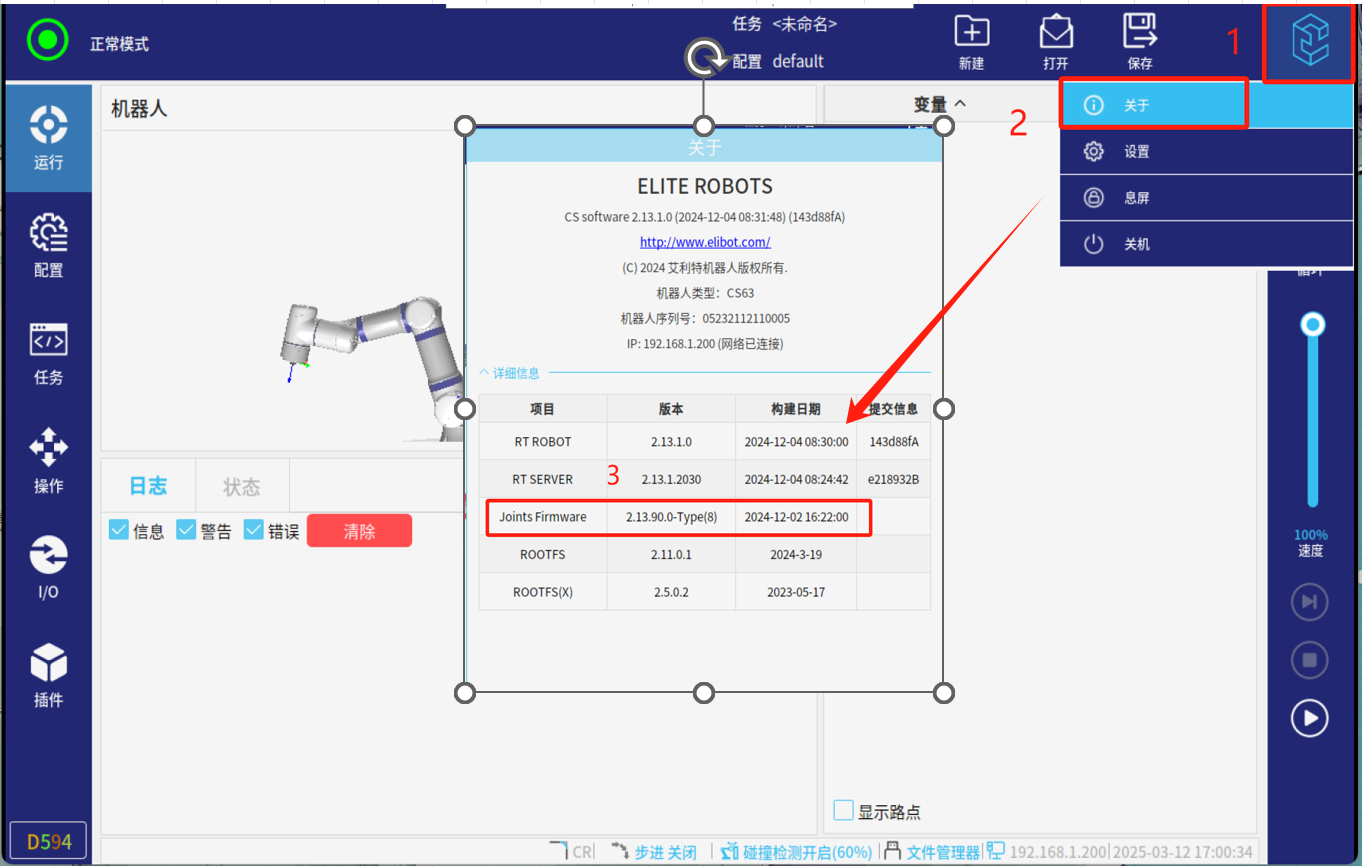 2、在正常模式下点击如图4-1所示右上角红框标注区域(连续快速点击 5-8 次)就会出现输入密码页面界,然后输入密码:elibot,进入专家模式;
