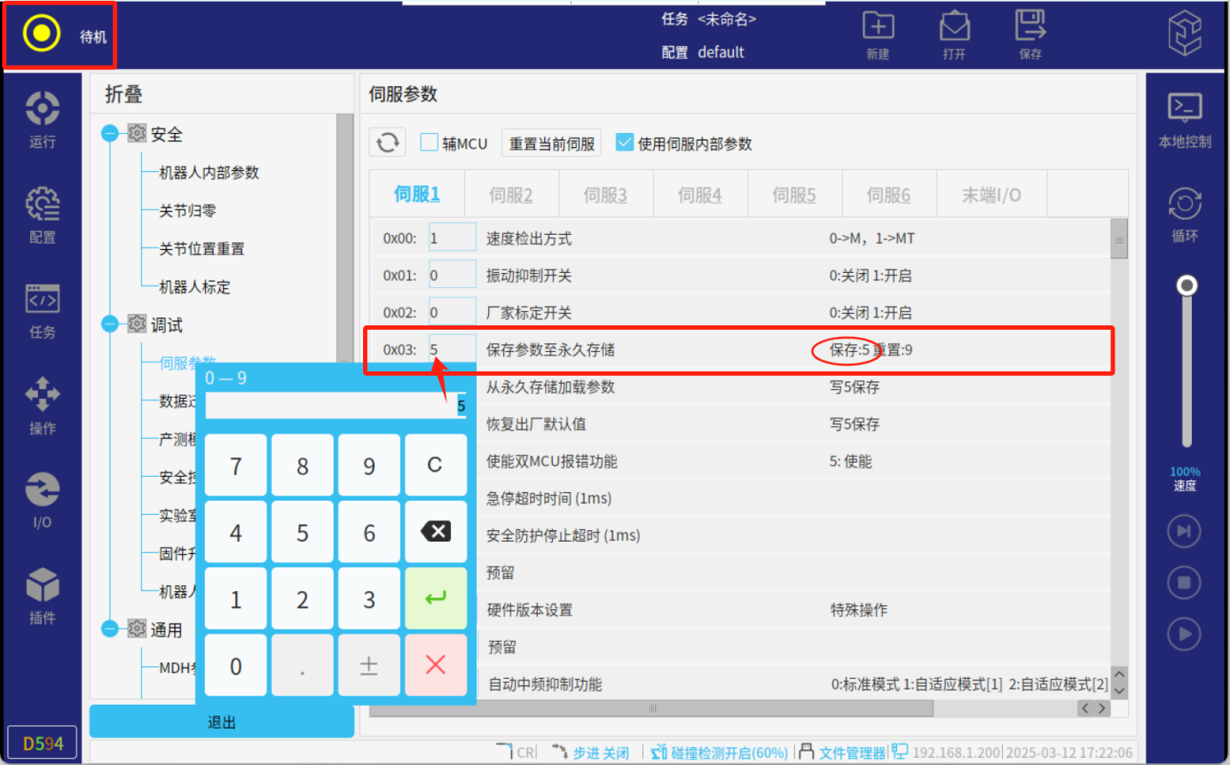 6、调整好参数后,需要保存至伺服,否则再次上电调整好的参数会丢失,Pn03参数写入5进行保存,机器人显示待机状态说明保存成功。