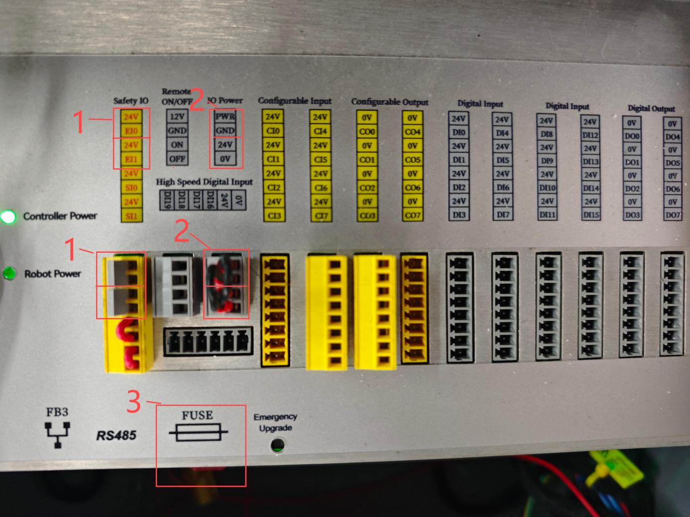 4.如以上均无异常,则可拔掉急停回路的黄色端子排,使用万用表"直流电"档位——排查“图-1”的1号位置分别测试(24V-EI0,24V-EI1;引脚)是否有24V电压,如无电压,可检查“图-1”的3号位置的保险丝拆下来查看保险丝是否已经熔断。