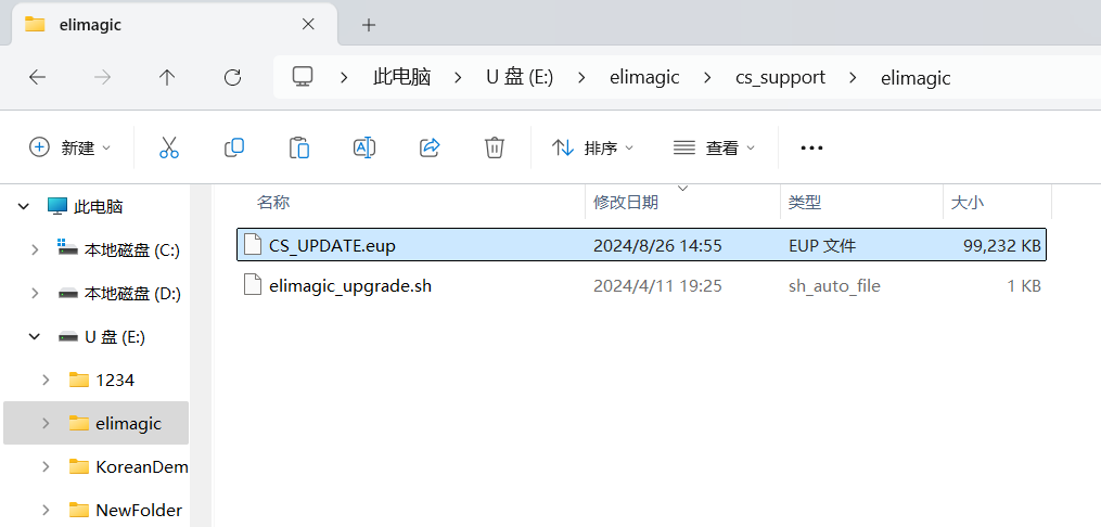 ○ 将.eup升级包放到elimagic_upgrade.sh脚本同一目录中,并将升级包重名为:CS_UPDATE.eup 。