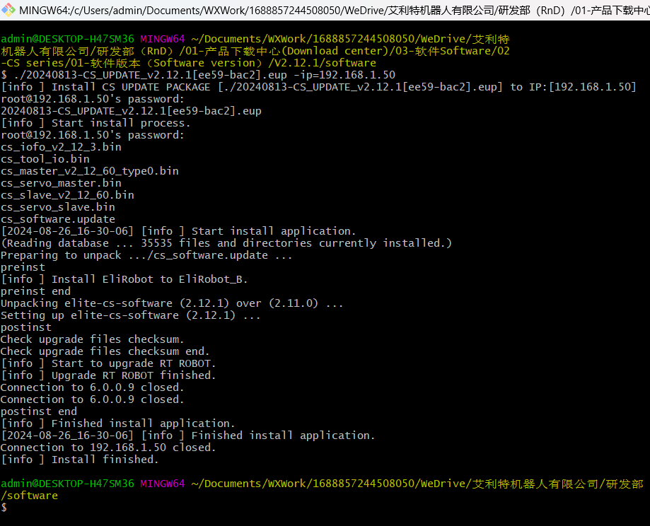 ○ 下载目标一站式升级包(.eup)放在PC任意目录,进入该目录后,通过终端工具,如windows下的git bash,或linux中的系统终端,在升级包所在的目录下,打开终端,执行下述命令。./CS_UPDATE_v2.9.0[dc71-3330].eup -ip=fb1_ip