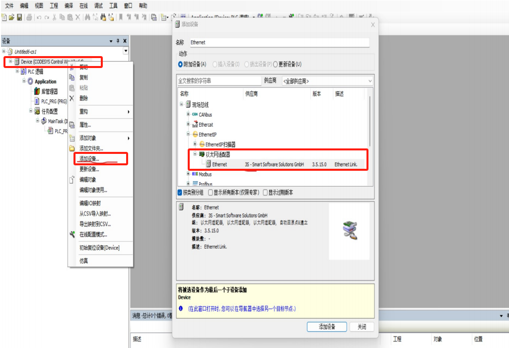 选择 Device-添加设备-EthernetIP-以太网适配器-Ethernet