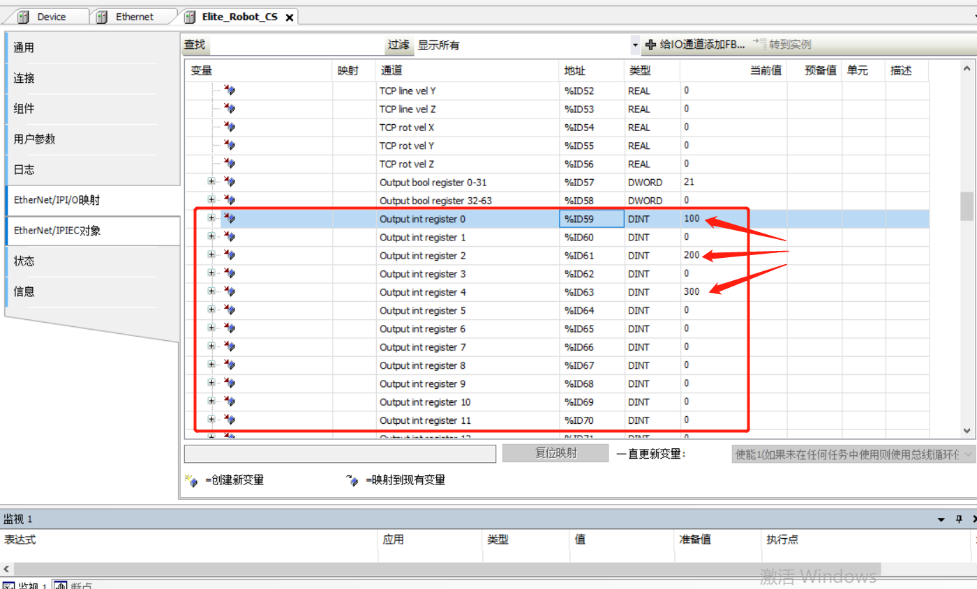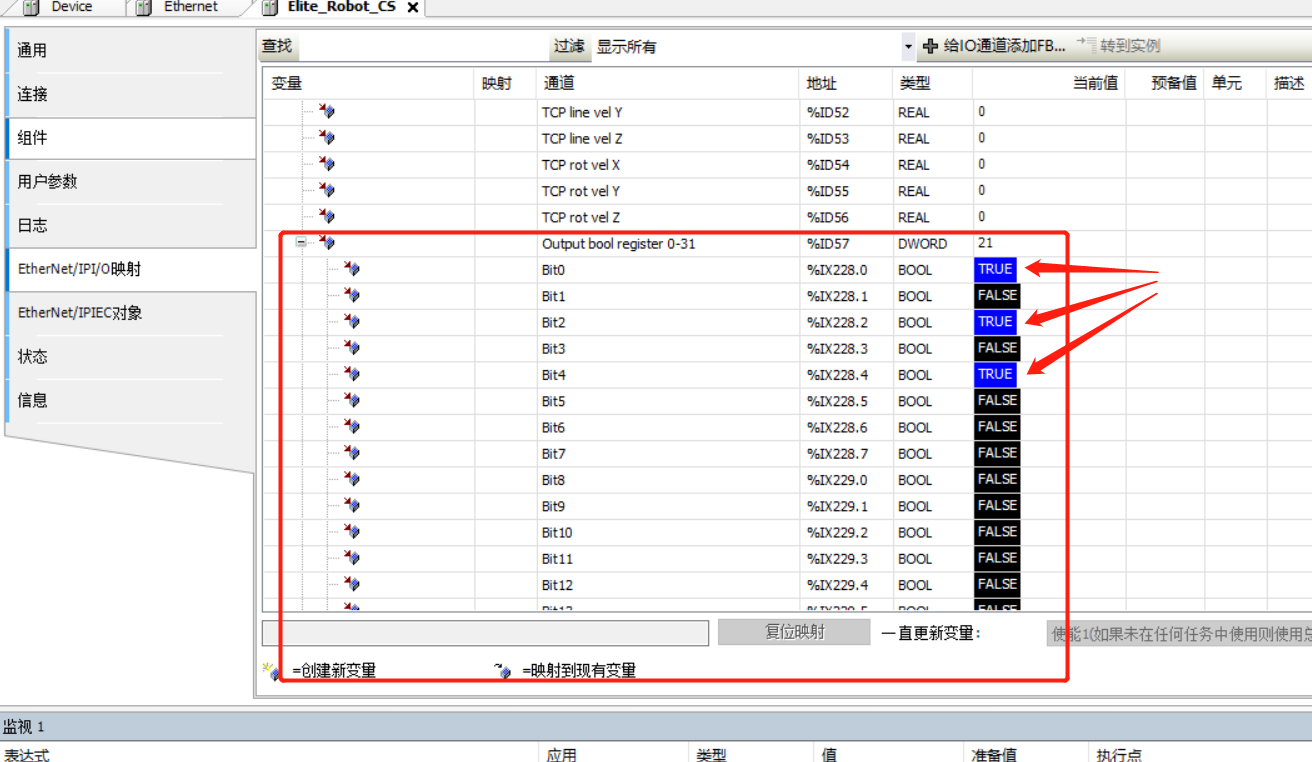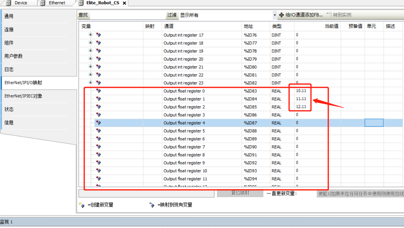 选择Elite_Robot_ CS---Ethernet/IPI/O映射,将ExlusiveOwner-1展开,可看到机器人当前的一些具体信息 (具体报文数据查看附录中的《CS_用户手册_EthernetIP数据格式》文档)