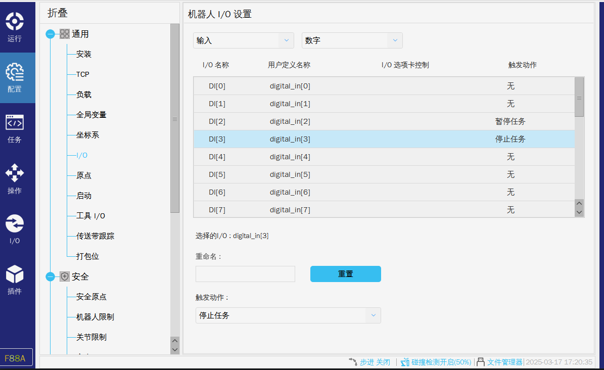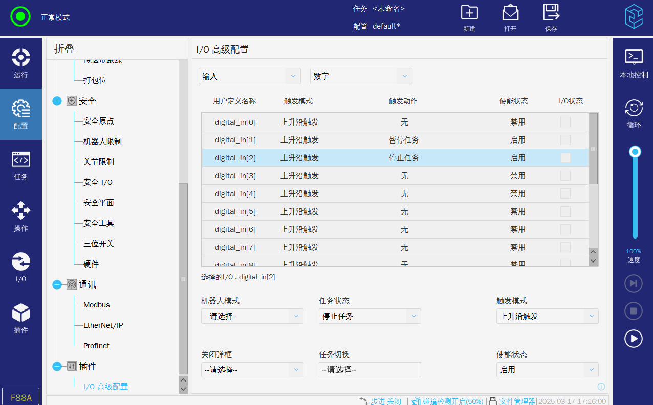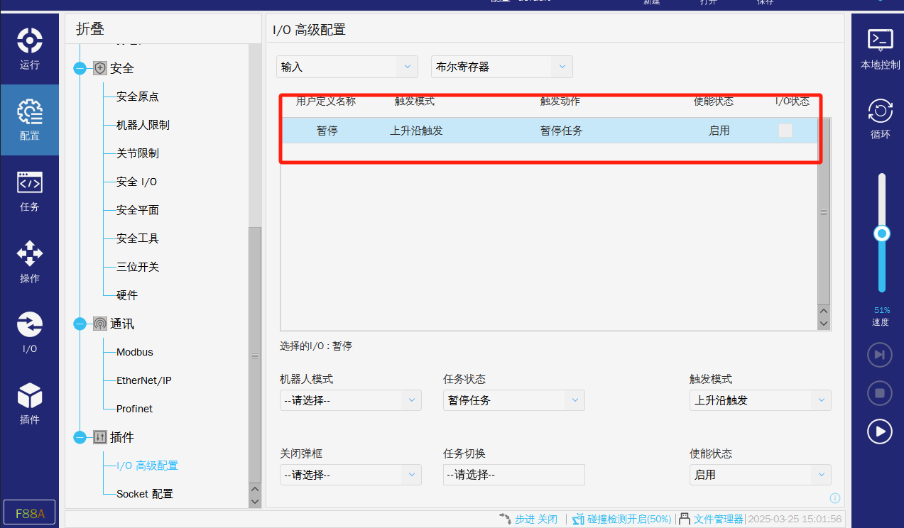 在使用硬接线的交互方式时,运行过程中如果无故暂停或者停止,可以查看以上两张图片是否有配置导致任务停止或者暂停。