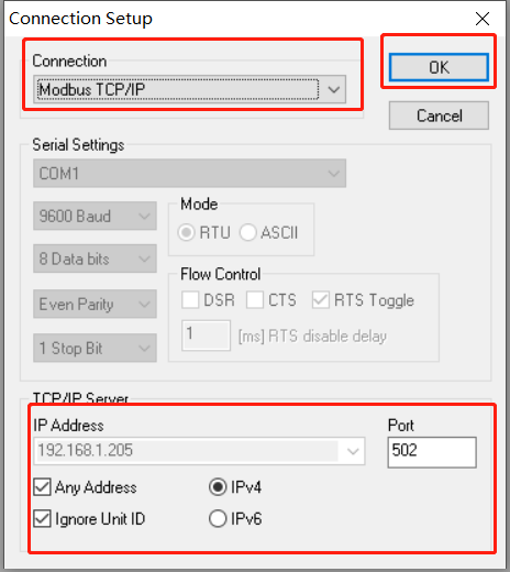 打开第三方网络调试助手modbus poll,--connection--connect,选择modbus tcp/ip,ip地址栏输入机器人的ip,端口默认502,最后点击ok