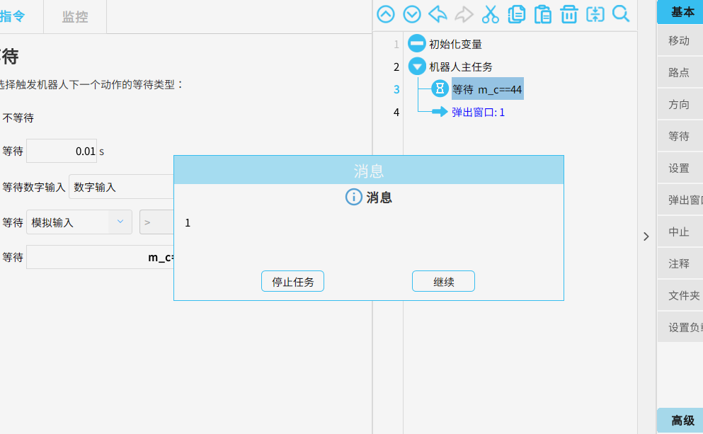 运行任务,当从站的信号modbus_2=3 时 ,页面弹出窗口提示“1”,代表已获取到该寄存器的值
