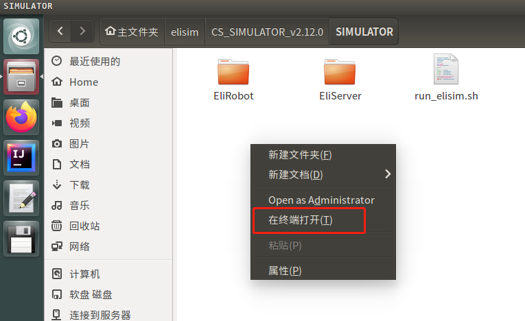 1. 退回到 SIMULATOR 目录下( elisim-CS_SIMULATOR_V2.12.0-SIMULATOR)右击鼠标,选择在终端打开。输入 ./run_elisim.sh或者点击Tab键补全,点击回车,打开机器人软件。