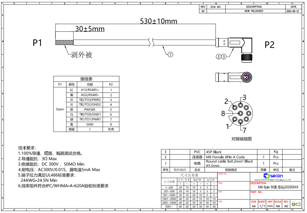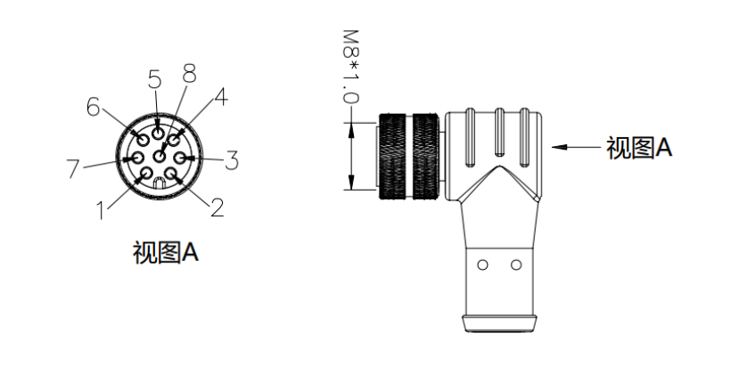 如果是用NG28娱乐提供的8芯弯头成型线,【物料号NA20300180】如图;则针脚编号、线序颜色为固定排序。