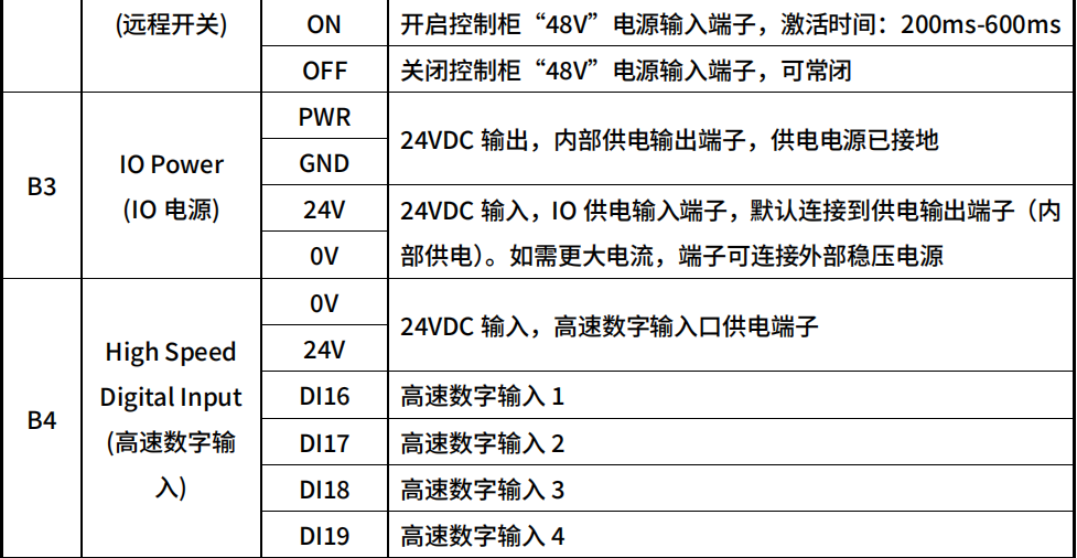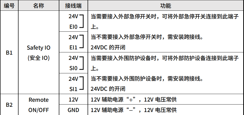 远程 ON/OFF 功能端子提供 12V 辅助电源。在控制柜主电源开关打开,同时控制柜未启动的情况下,功能端子的 12V 辅助电源端子将保持带电状态。