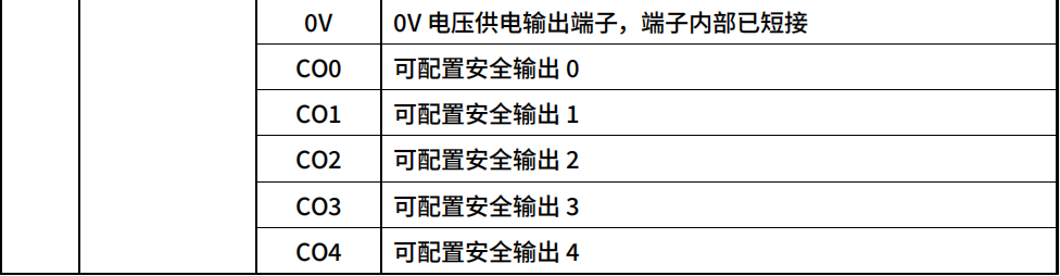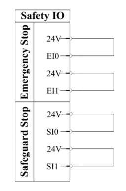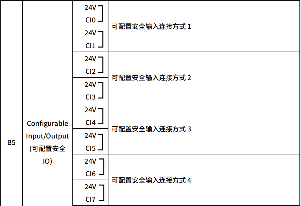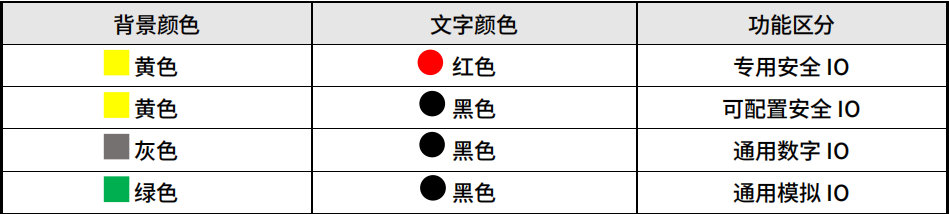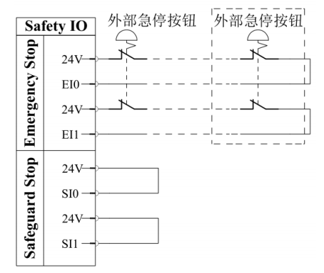 所有安全 IO 成对存在(冗余),必须保留成两个独立的分支。单一故障不会导致丧失安全功能。固定的输入有两个:紧急停止和防护停止。紧急停止输入仅用于紧急停止设备。防护停止输入可用于所有类型的安全型保护设备。