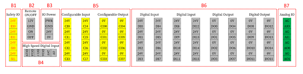 CS机器人内部电气IO接口包括安全 IO、远程开关、高速数字输入,IO电源、可配置 IO、数字 IO 和模拟 IO。输入和输出都为PNP型