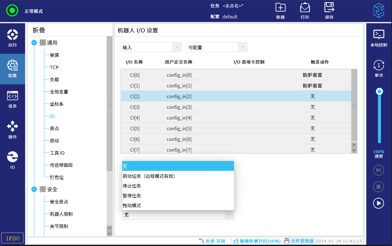 可配置输入可以设置成:启动任务、停止任务、暂停任务、拖动模式