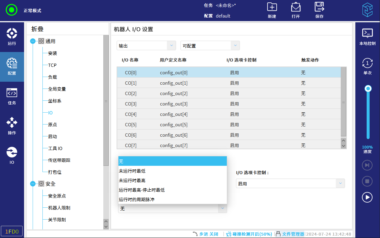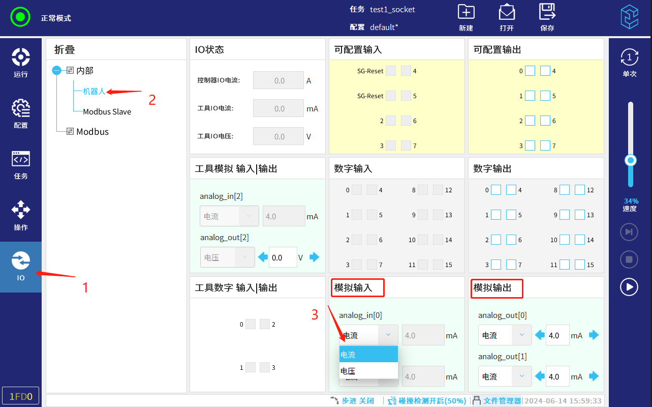 在示教器界面IO中可以对模拟输入和模拟输出类型进行选择切换,选择电流或电压。
