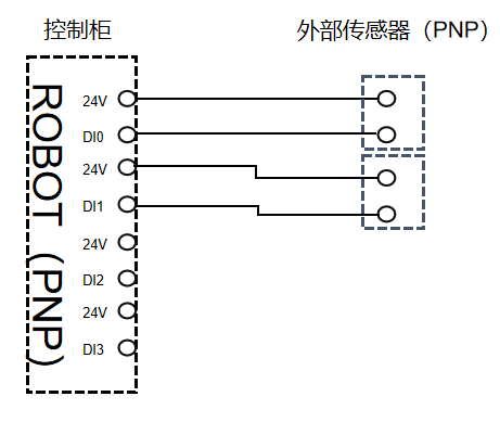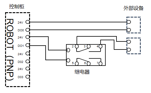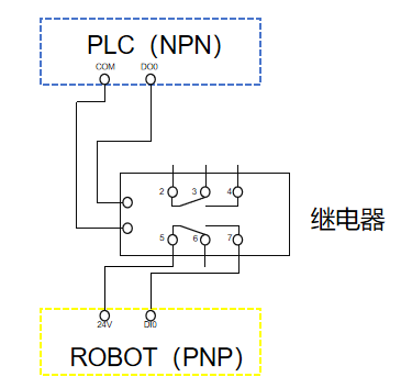 在实际使用过程中可能会遇到各种传感器与PLC,PNP与NPN的都有,这种情况可以通过中间继电器进行信号转换,具体方法为将外部设备(如PLC)的输出信号接在继电器的线圈端,机器人输入接在继电器的常开触点端,当外部设备输出信号时,线圈得电,触点吸合,机器人得电。(输出接法则相反)