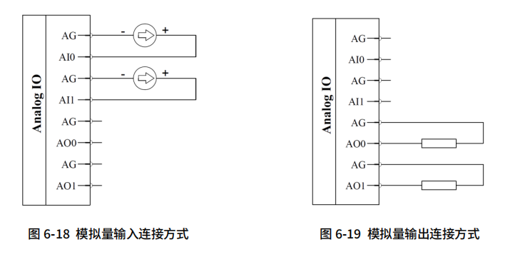 模拟 IO 接口可用于接收/发送模拟量信号(电压(0V~10V)或电流(4mA~20mA))。