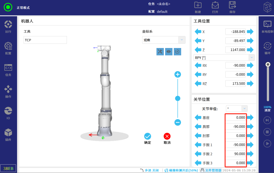进入下图页面,在右侧修改对应型号六轴姿态角度(具体查看本文档新/旧各机型打包姿态角度),点击“确定”,确保空间足够后按住“自动移动”