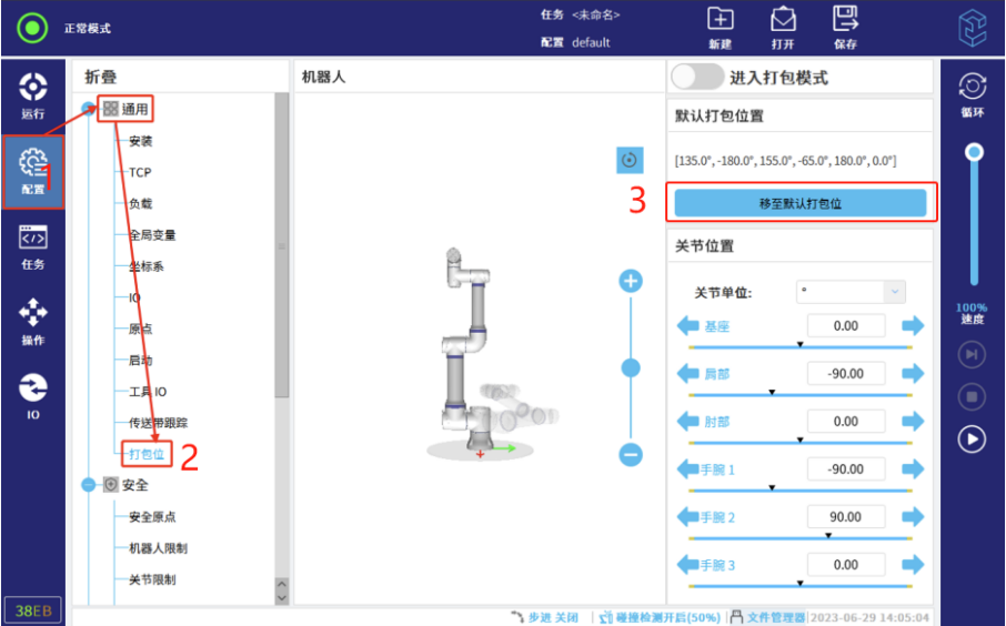 按钮可进入自动移动页面,将机器人移动至打包位置。若用户在当前机器 人配置中设置了安全平面、关节范围等数据,导致打包位置无法到达,可选择“进入打包模式”,在打包模式下,机器人运动范围将不再检测安全平面和关节位置极限,此时机器人可以正常运行至打包位。 离开打包位页面后,系统将自动退出打包模式。