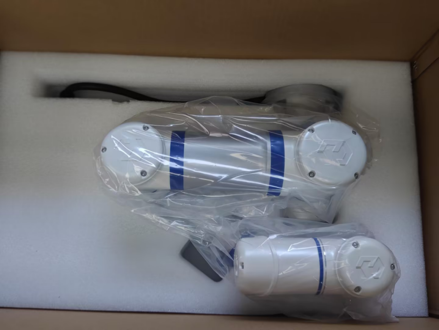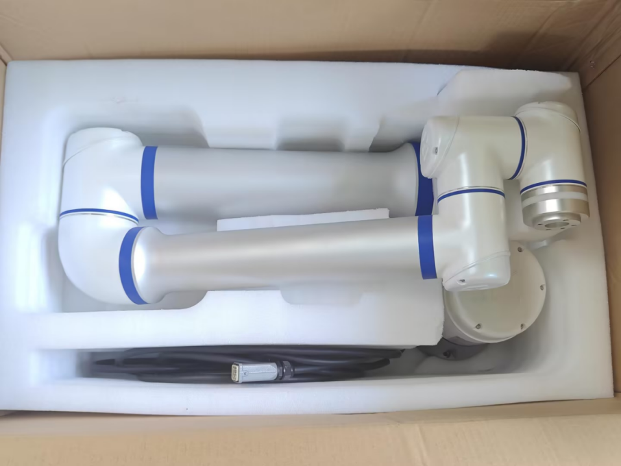 打包过程如下图所示(以 CS612 为例):使用机器人 打包程序设定调整好打包姿态时,(旧款纸箱将本体垫块垫在肩部关节与手腕关节之间,确认起到充足的支撑作用后),将本体放入下包材中,确认整个大臂和肘部关节被有 效支撑后,盖上上包材,最后封好纸箱。