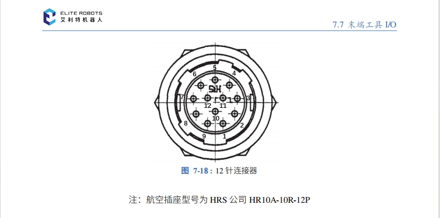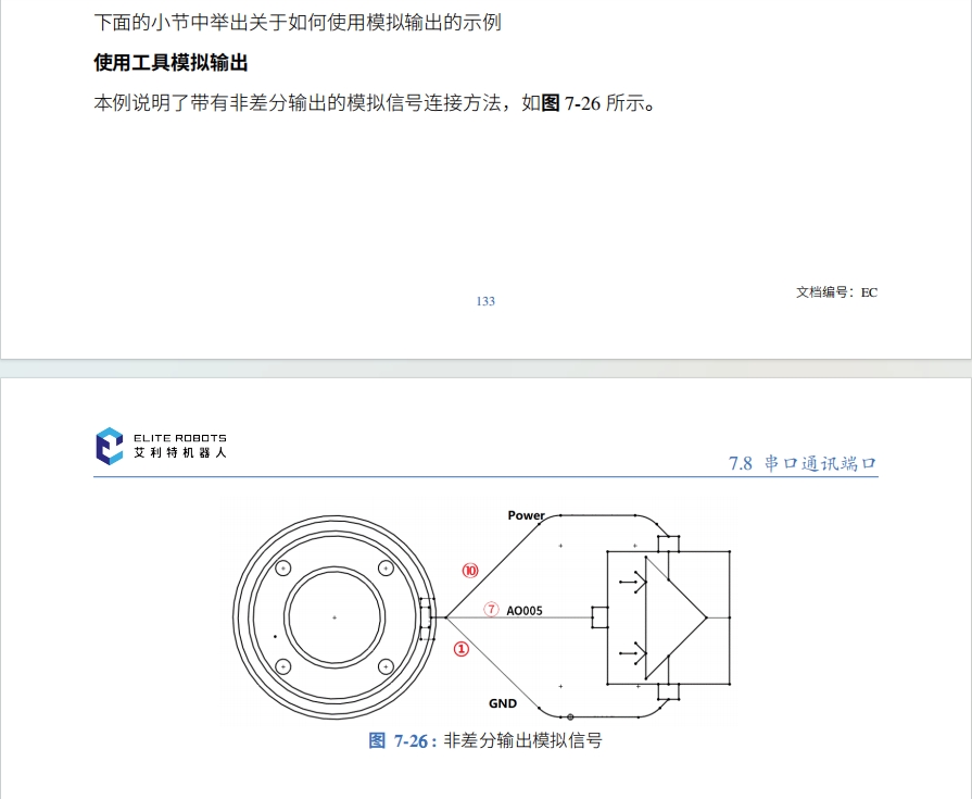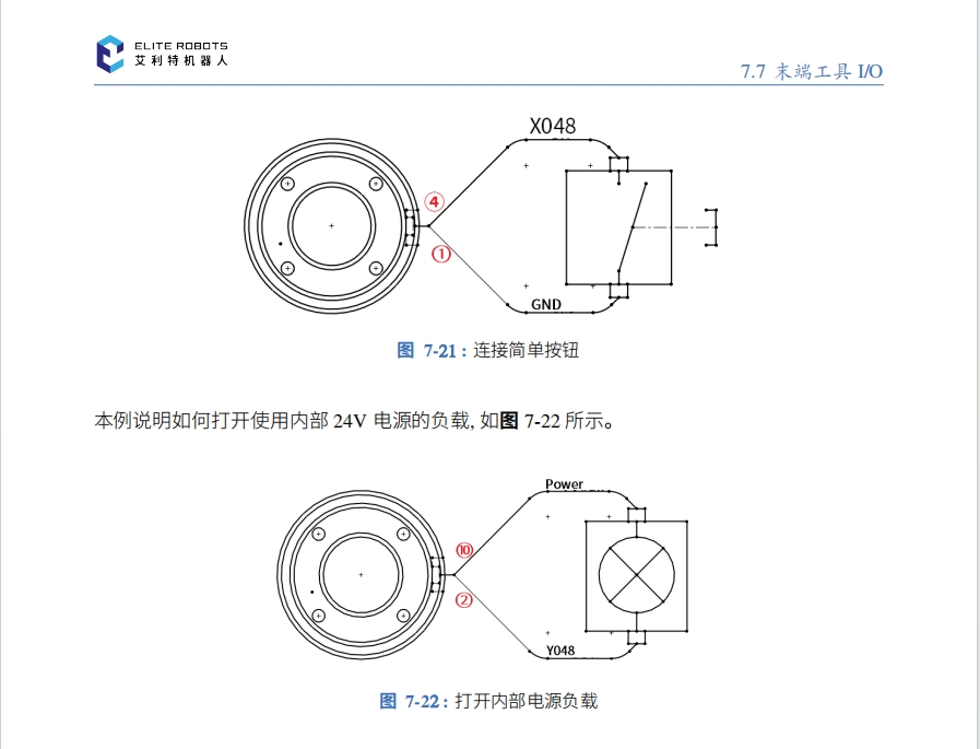 EC机器人除了控制柜提供了IO接口与485接口外,在机器人末端也提供了IO接口,其中包括2路数字输入,2路数字输出,1路模拟输入,1路模拟输出,24V供电与1路485接口。