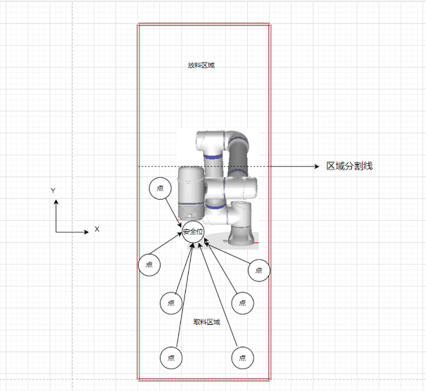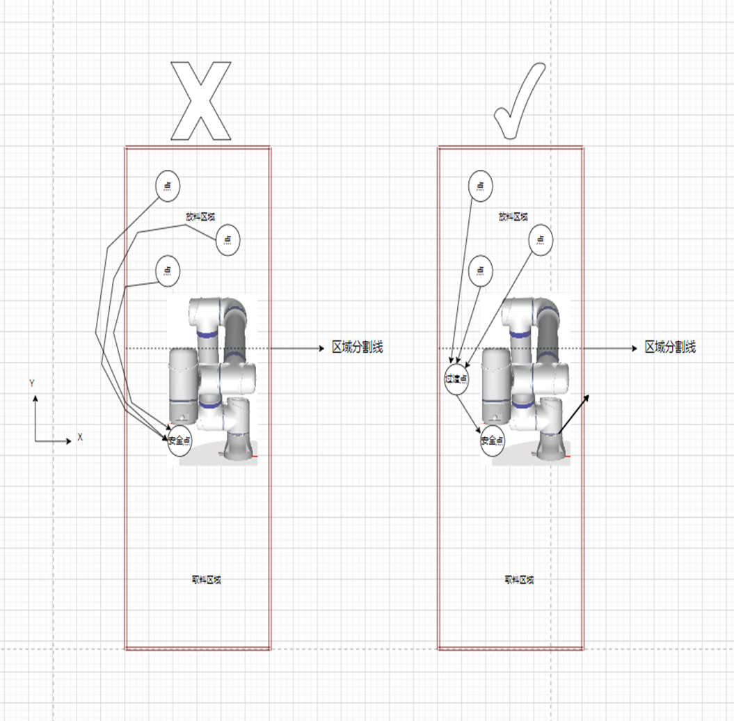 1.由下图案例可将工作区域分为取料取料和放料区域,取料区域由图2-1可见在任意一点都可以回安全点,那么NG28娱乐就可以直接判断是否在取料区域上升到安全高度直接回安全点即可。