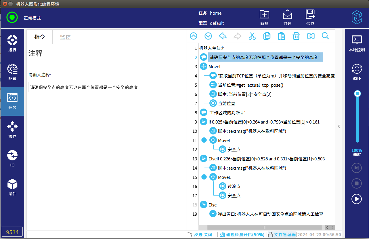 4. 考虑到正在取料/放料的时候直接回安全位,可能会碰到料盘,治具等机器人接触之类的物品,所以在获取当前位置后直线上升到一个安全高度,不建议使用偏移Z+方向的方式抬高的方式,因为有可能在手动移动后,机器人已经在一个比较危险的高度,再次抬高可能会碰到上方物品,应该把安全点的高度赋值给当前位置的Z方向(根据现场实际情况选择直接赋值安全点的高度还是赋值一个固定的高度),运行后机器人会在原地上升或下降到一个安全高度,这样更安全。