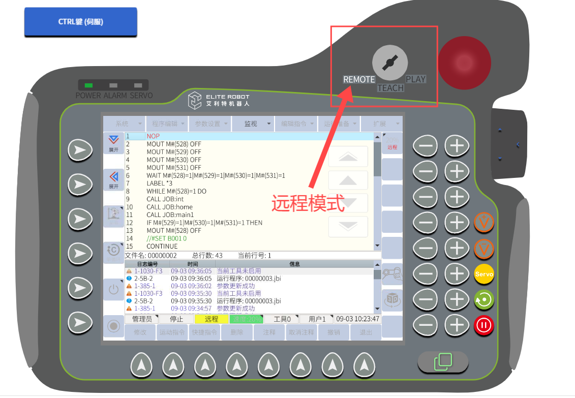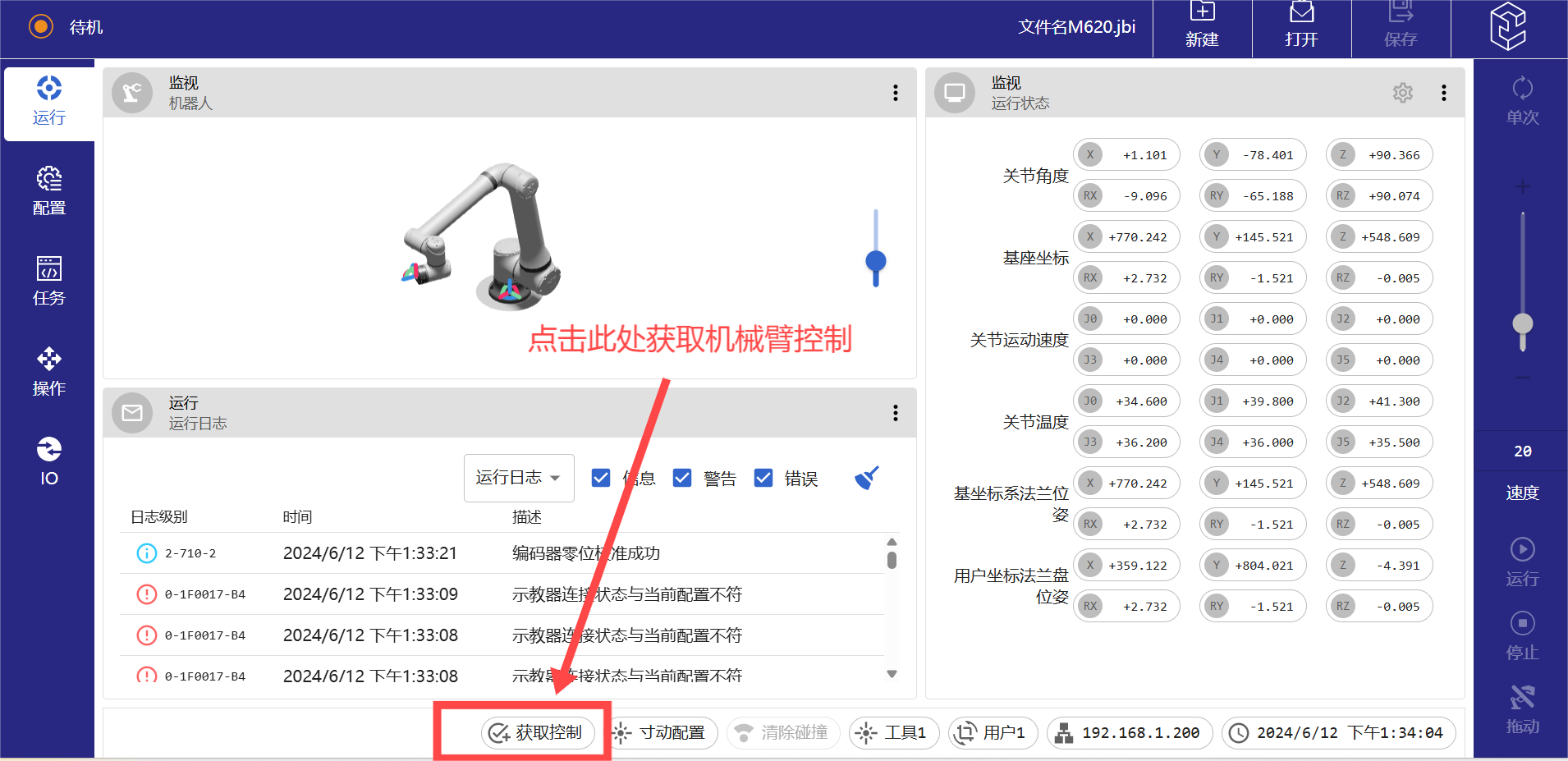 (5)进入网页版示教器后,和另外两种方法一样,先点击下方菜单栏里面的获取控制按键,等待获取控制按键从白色变为绿色后,即可操作网页版示教器上面的操作界面。